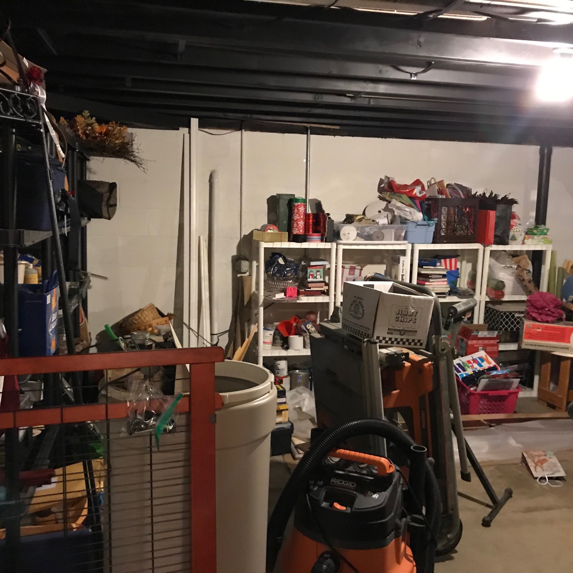 I love before and after comparison pictures, so I thought I would share my latest project here. I recently did an organizing job in a client’s basement. Their basement had become so cluttered that they couldn’t get to any of their shelves to put things away, so it just kind of piled up.